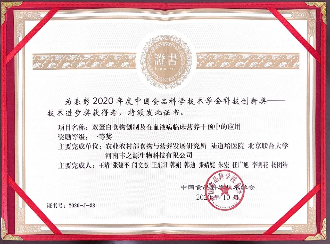 “雙蛋白食物創(chuàng)制及在血液病臨床營(yíng)養(yǎng)干預(yù)中的應(yīng)用”項(xiàng)目獲得2020年度中國食品科學(xué)技術(shù)學(xué)會(huì)科技創(chuàng)新獎(jiǎng)-技術(shù)進(jìn)步一等獎(jiǎng)。