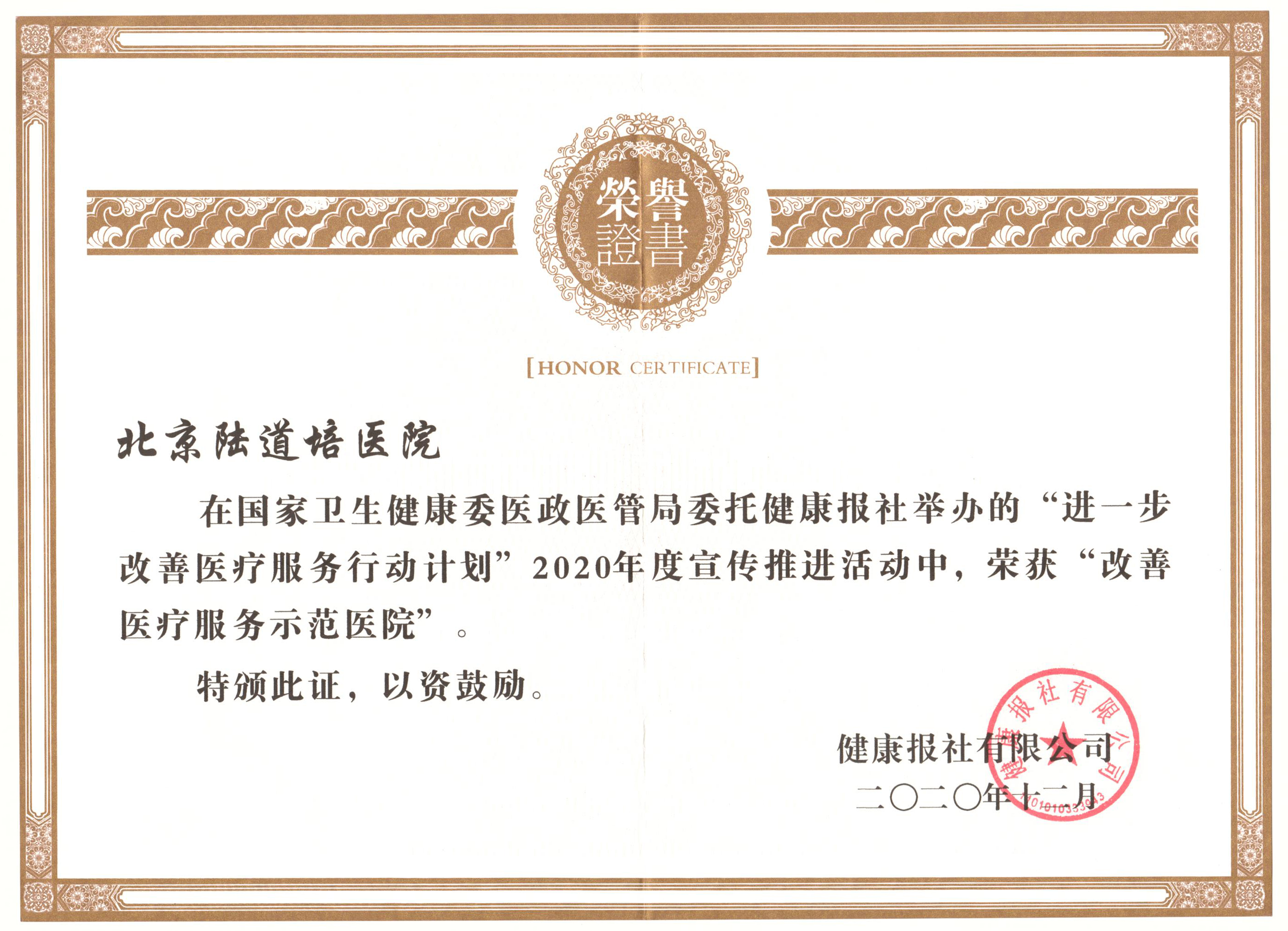 2021年1月10日北京陸道培醫(yī)院獲得全國“改善醫(yī)療服務(wù)示范醫(yī)院”殊榮。