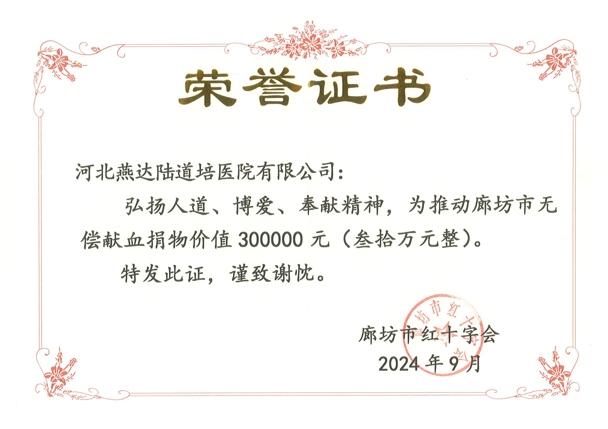弘揚人道、博愛、奉獻(xiàn)精神,為推動廊坊市無償獻(xiàn)血捐物價值 300000 元(叁拾萬元整)。